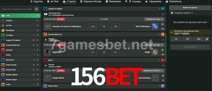 O 156Bet oferece uma grande seleção de opções de apostas em e-sports com probabilidades competitivas